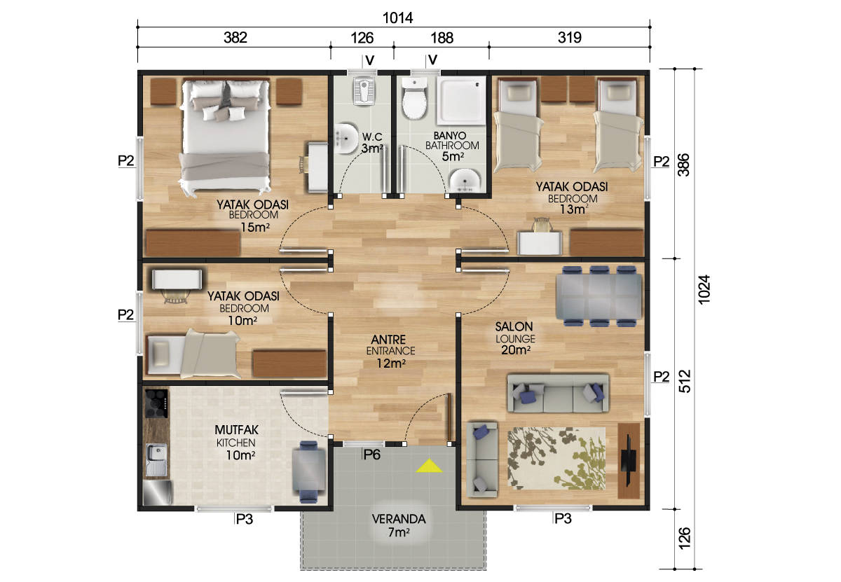 Yukarıda görseline baktığınız 96 m² eviniz dış görünüşüyle olsun, iç plan ölçüleriyle olsun tamamen bir uyum projesidir. Yaman Prefabrik sizler için tasarladığı bu ev (prefabrik konut) odalara kolayca erişmeniz için de sizlere yardımcı olmaktadır.