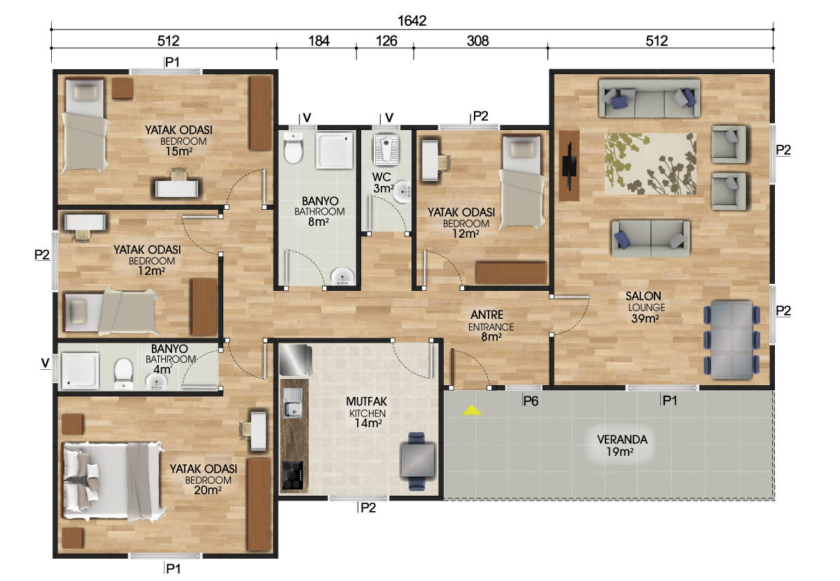 Genel itibariyle kalabalık bir aile için fayda sağlayacak 166 m² prefabrik konut misafirlerinizle de keyifli vakitler geçirebilmeniz adına her bir m² si özenle düşünülüp tasarlanmıştır.